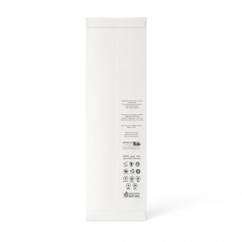 Cepillo de dientes de bioplástico Wheat Straw de 17.5cm de largo, presentado en Sachet de Stone Paper de 20x6cm impreso con tinta a base de soya.